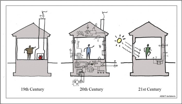 "자료 내려받기" 게시판의 "프로젝트소개"에도 올려 놓았지만, 미국의 건축사가 과거의 집과 패시브하우스가 어떻게 다른지를 아주 쉽게 그려놓은 개념도가 있어 첨부한다.
