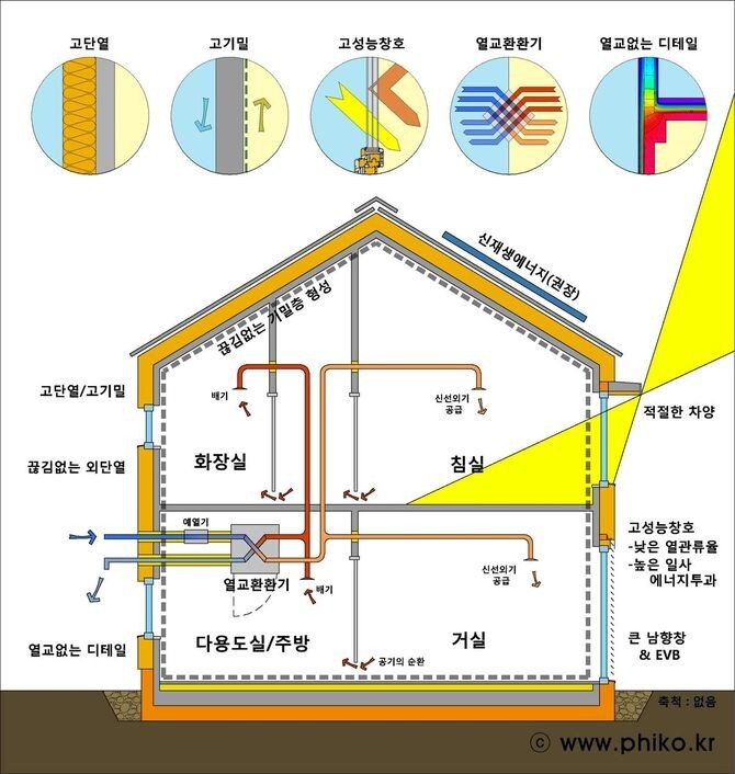 이 방법은 두가지 이유로 우리나라에는 적합하지 않다고 보았기 때문에 협회의 패시브하우스 정의 그림에는 예열기를 통해서 온도를 올리는 것으로 설명되었다.