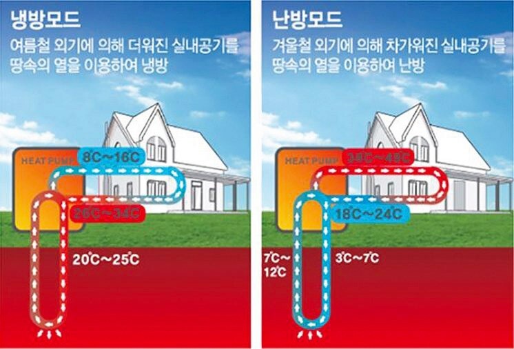 <지열발전은 사계절 내내 일정한 온도를 유지해 여름엔 냉방, 겨울엔 난방모드로 이용한다.>