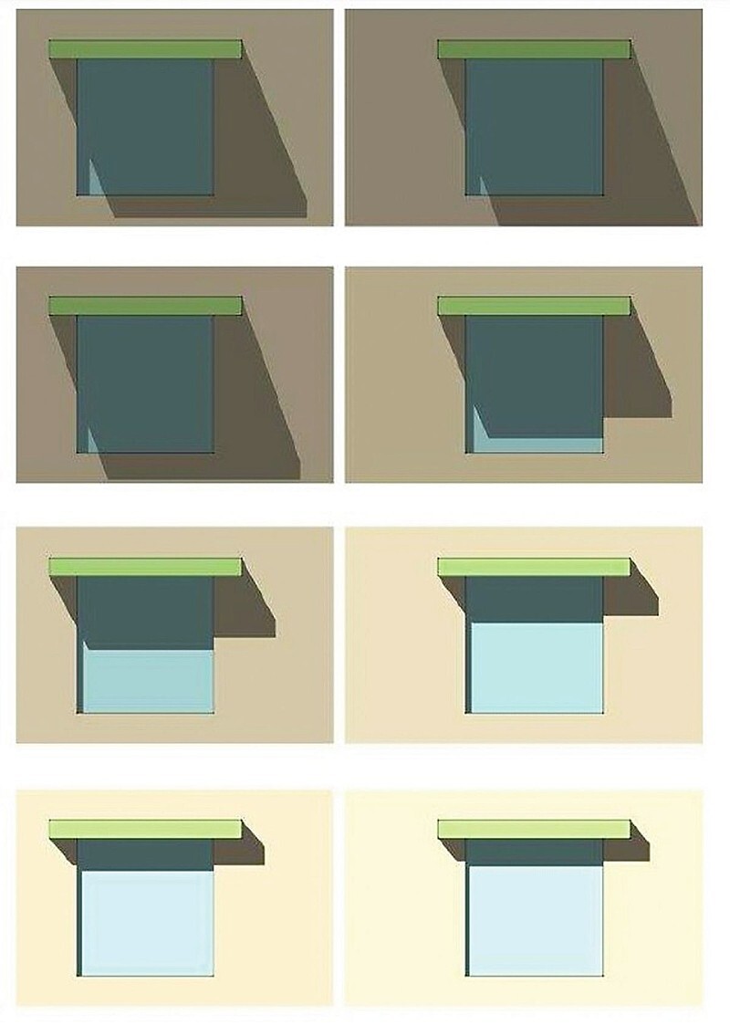 외부차양 겨울철 일사 획득을 위해 남측에 창을 내지만, 한 여름엔 햇빛이 오히려 실내 온도를 높여 에너지 낭비를 가져온다. 이러한 햇빛을 차단하기 위해 창 외측에 차양시설을 설치한다. 커튼과 다르게 차양을 외측에 설치하는 이유는 유리를 통과한 단파 에너지가 물체에 반사되면서 열에너지로 변하는데, 열에너지는 장파라 유리를 통해 다시 밖으로 빠져나가지 못하기 때문이다. 만약 비용 땜누에 외부차양을 모두 설치하기 어렵다면, 눈썹처마를 이용하는 방법도 있다.