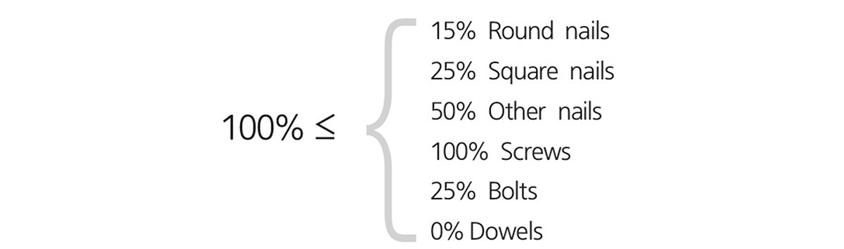 인장력을 받는 못이나 스크류 등 체결 장치 표면이 나사산(Threading)으로 되어 있거나 원형링 형식으로 홈이 파인 경우에는 목재 간 전단응력이 높아지기 때문에 더욱 견고한 벽을 만들 수 있따. [표 1]의 공식으로 체결철물의 종류에 따른 전단응력을 가늠해 볼 수 있다.