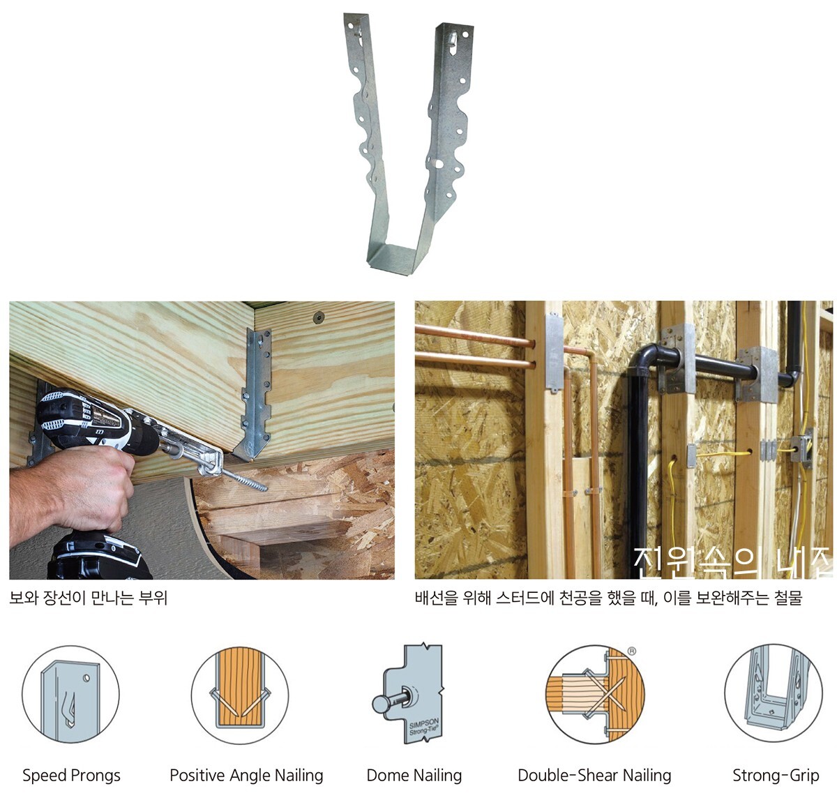 [그림 4]는 보와 장선이 만나는 부분의 장선걸이와 스터드(Stud) 등에 각종 배선을 위해 구조재를 천공하는 경우, 접합철물을 어떻게 사용하는지 보여 준다. 연결철물을 자세히 보면 못을 박을 곳에 미리 구멍이 뚫려 있다. 목조건축 규정에 보면 각 부위별로 필요한 못의 직경과 개수 그리고 못박기 방법 등이 있다. 천공된 부분에 규정도니 깊이의 못을 박으면 적합한 시공이 되는 것이다. 또한, 제조사에서 제품별로 하중기간을 적용한 허용가중 값을 제공하고 있어 건축물 각 부재에 작용하는 하중량에 따라서 제품을 선택하면 도니다. 이 하중 값들은 수많은 실험과 경험으로 도출해낸 결과물이다.