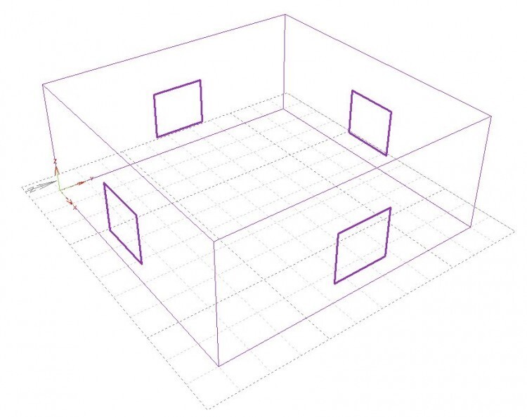 사용된 기상데이타는 협회 자료실에 올린 Ecotect_Seoul_phiko.wea 를 사용했으며, 아래 그림과 같이 각 방위에 정렬된 직사각형의 매스에 각 2x1.8 m의 창을 두고 각 방위별 수직면의 일사량을 시뮬레이션하였다.