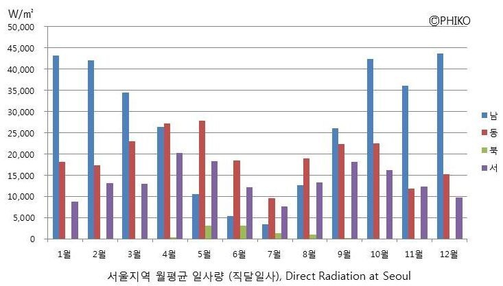 오히려 여름철 직달일사의 경우 동향과 서향의 양이 더 많기 때문에 차양설계가 까다로운 동/서향의 경우 창문의 설치를 최소화하는 것이 여름 냉방부하를 줄이는데 도움이 된다.