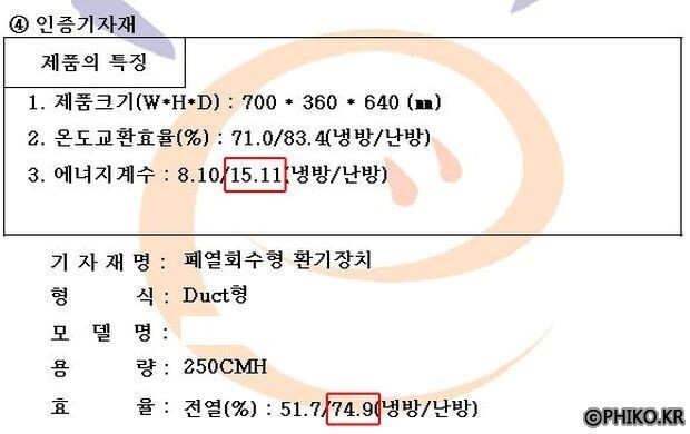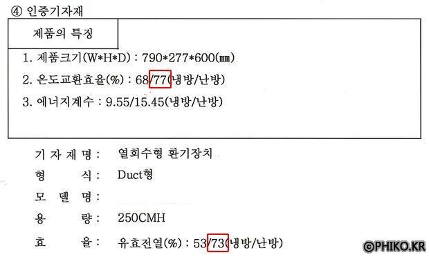 그러므로 진정한 열교환효율은 시험성적서의 아래 쪽을 확인하는 것이 맞다.