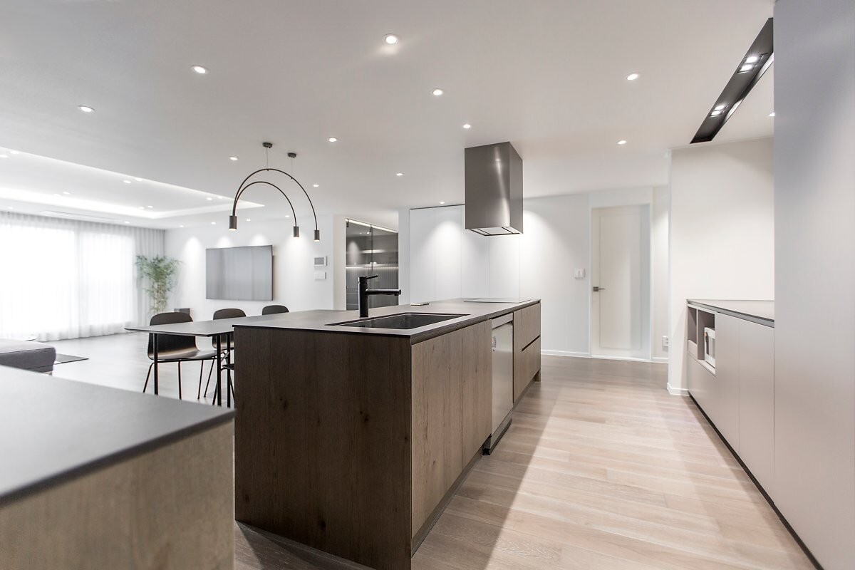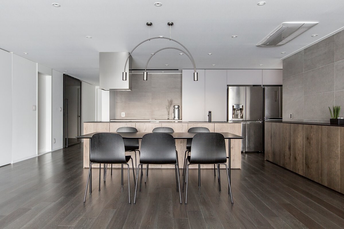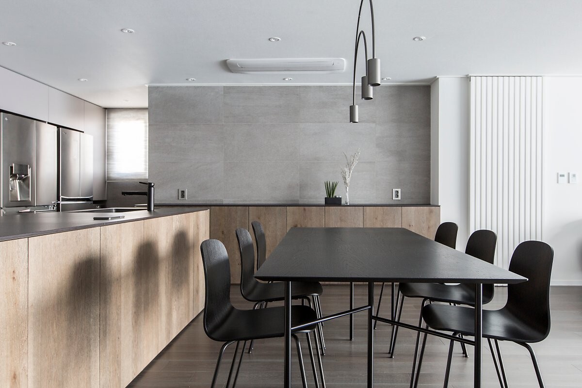 1. 나무 질감이 그대로 살아 있는 무늬목 가구에 블랙 도장 가구, 세라믹 상판 등 그레이와 블랙 등을 매치해 도시적인 분위기를 이끌어 냈다.