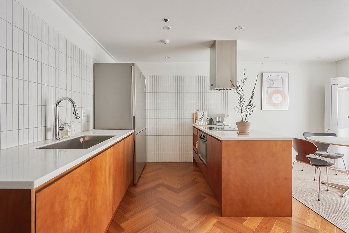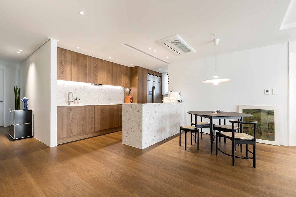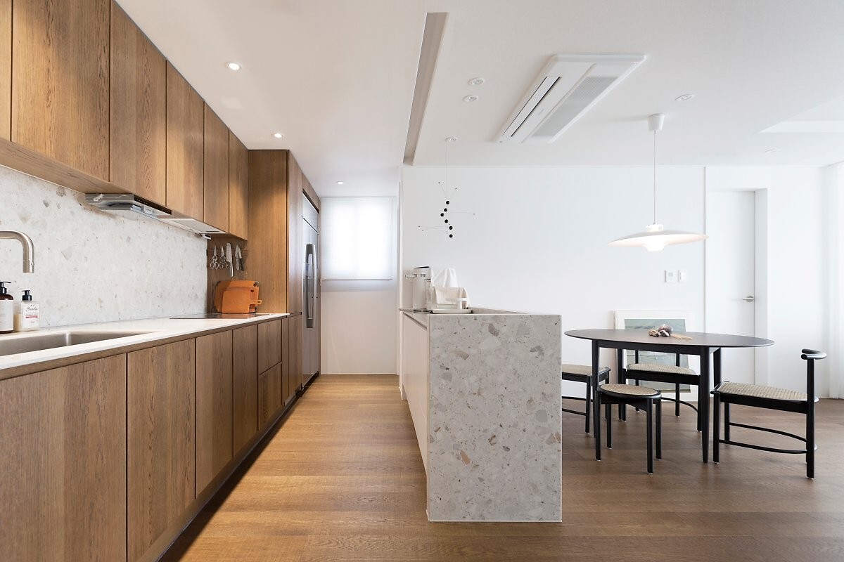 3. 주방 레이아웃은 11자. 아일랜드 조리대 뒤쪽응로도 하부장은 화이트 톤으로 마무리해 무늬목으로 막마된 아일랜드가 돋보이도록 했다.