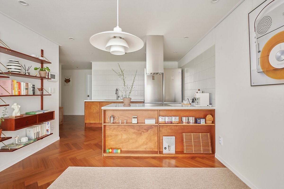 2. 주방 가구를 다양한 컬러를 낼 수 있는 합판으로 제작했다. 덕분에 가구 컬러를 헤링본 패턴 시공의 마루와 맞춰 통일감 있는 주방으로 완성할 수 있었다.