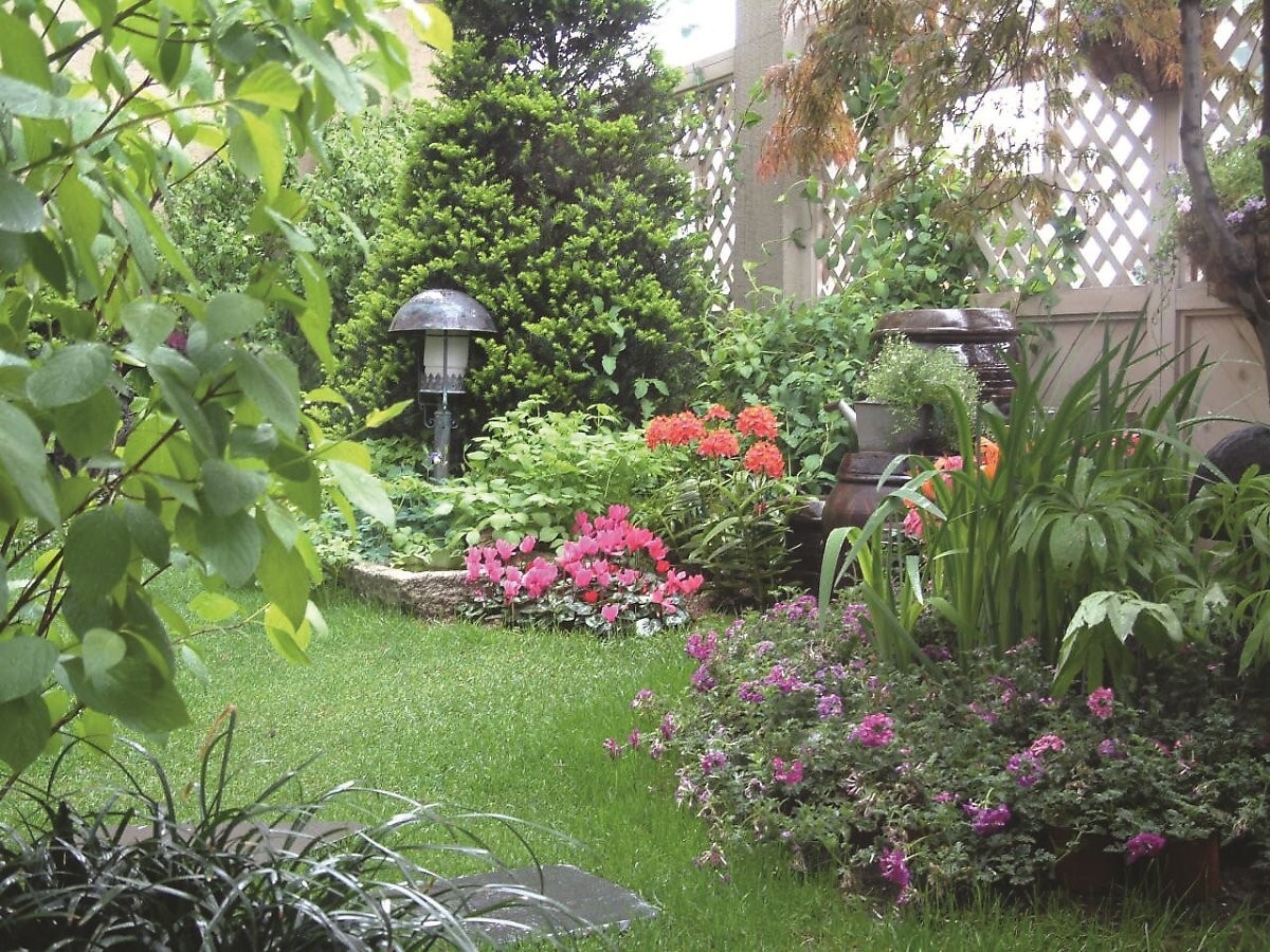 시클라멘과 파라솔, 나리 등의 꽃잎들이 초록색 잔디와 어울린 정원은 보는 이의 눈을 즐겁게 한다.