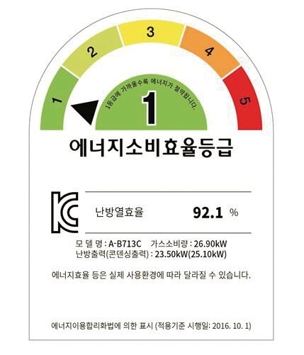 에너지 소비 효율 등급_효율이 높은 보일러는 같은 양의 에너지로 더 많은 열을 생산하면서도 난방비를 줄여준다. 따라서 에너지 소비 효율 등급 표시를 확인하면 선택에 도움이 된다. 특히 가정용 보일러는 다른 가전제품과 마찬가지로 1~5등급으로 표시된다. 1등급에 가까울수록 에너지 절약형 제품이기에 1등급 보일러를 선택하는 것이 바람직하다.