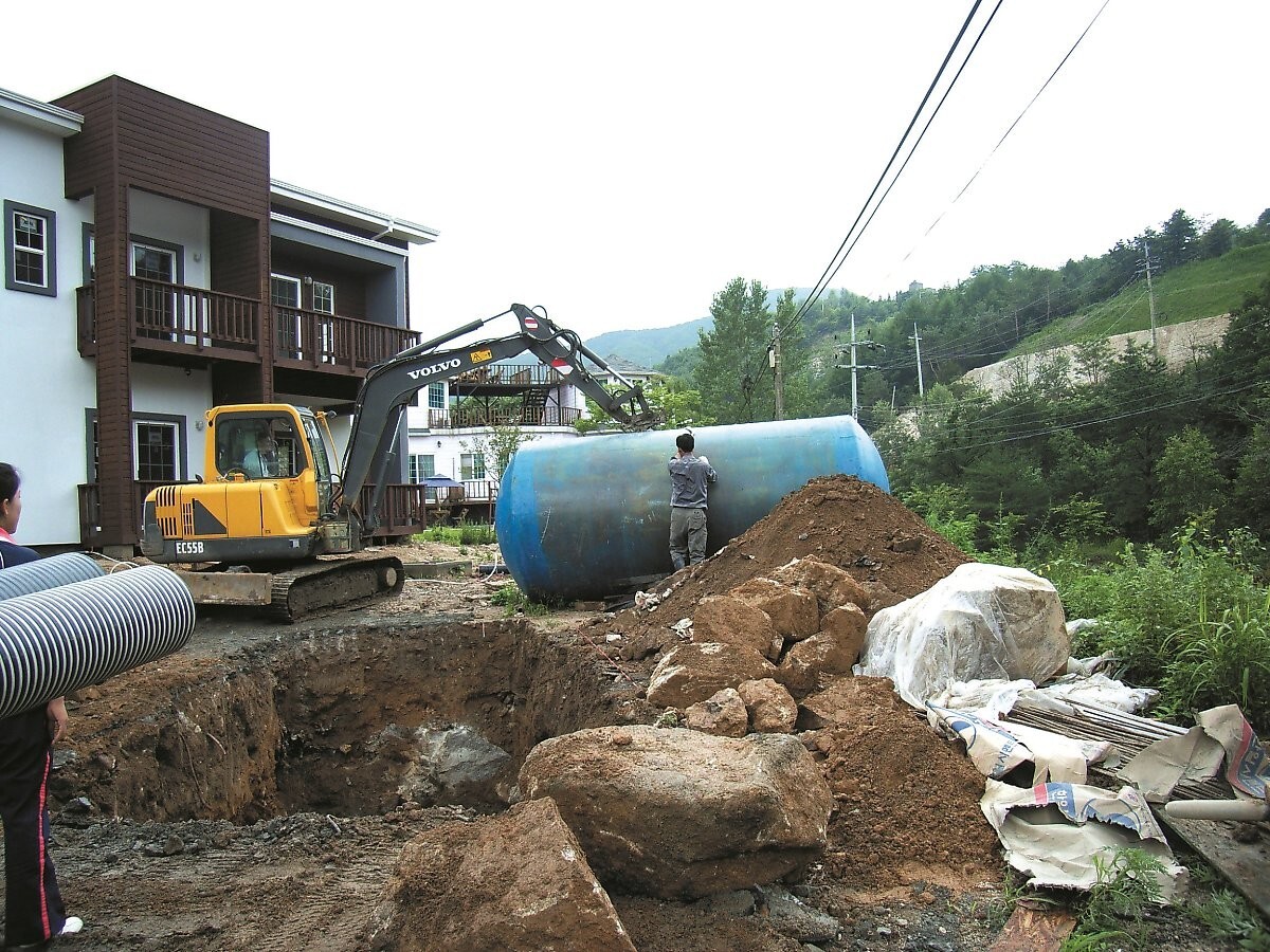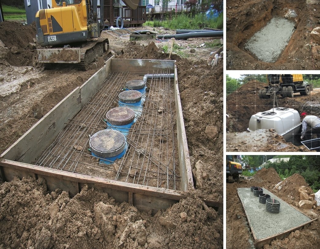 정화조 시공은 땅속에 콘크리트 박스를 만들고, 여기에 정화조를 넣은 후 상부에 콘크리트를 타설하고 공기를 주입하는 전기 에어 브로어Air Blower를 설치하는 과정으로 이뤄진다. 이 과정은 관련 법으로 정한 기준을 따르고, 반드시 공정별 사진을 촬영해 준공할 때 행정 관청에 제출해야 한다.