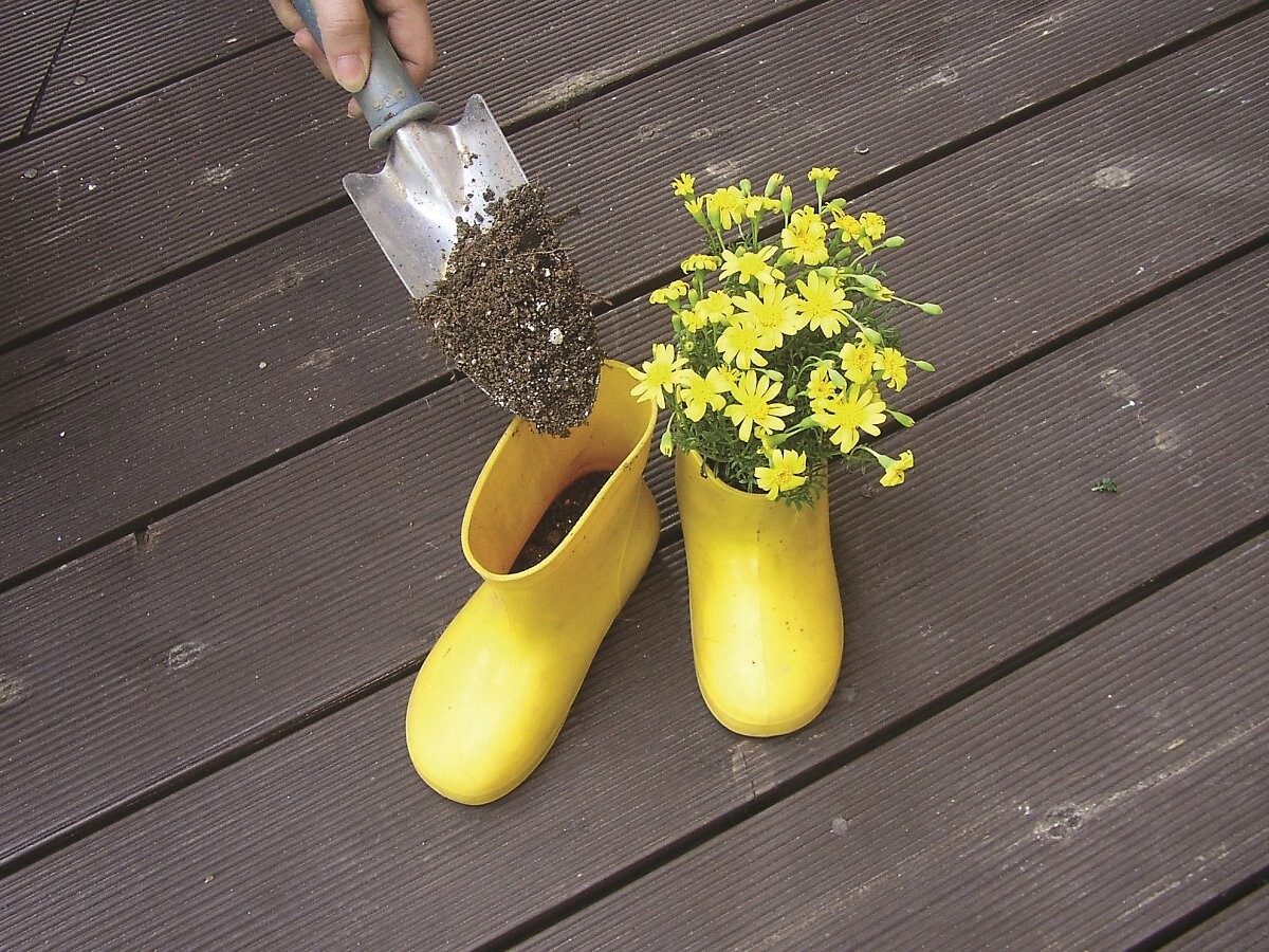 아이들이 신다가 신발장 한구석에 쌓아둔 낡은 신발이나 장화가 있다면, 이런 정원은 어떨까? 아이들과 함께 자신이 신던 운동화나 장화에 직접 꽃을 심는 작업을 해보자. 신발을 재활용할 수도 있고, 무엇보다 아이와 함께 흥미롭게 자연을 체험하는 기회가 될 것이다.