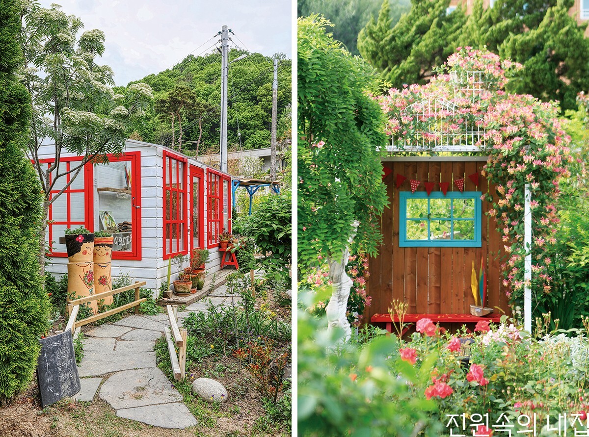 그녀의 정원엔 창고 하나도 허투루 있지 않다. 원색의 목가적인 분위기의 오브제들 사이로 수목이 가득하다.