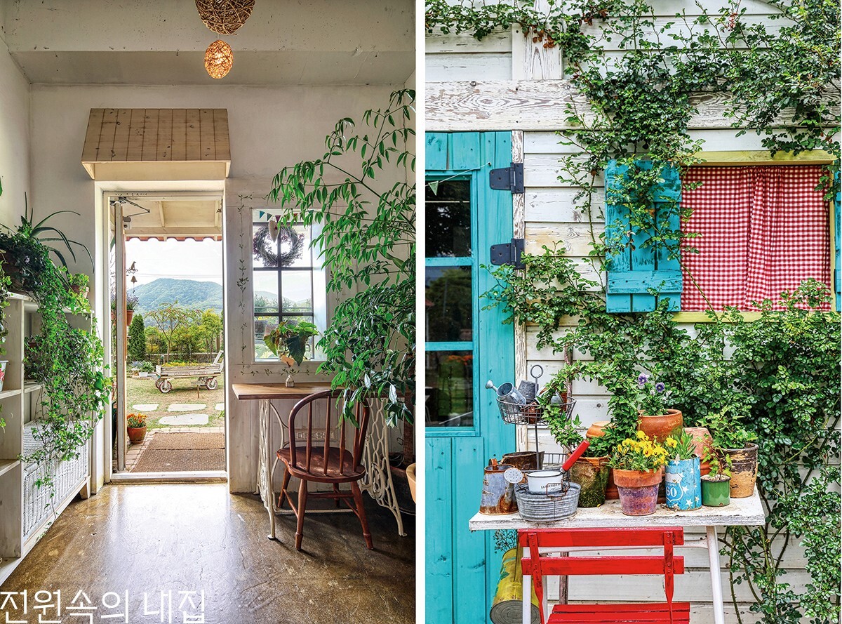 그녀는 형식에 치우치지 않는 자연스러운 정원을 추구한다. 오래 보아도 질리지 않는 컨트리한 스타일로 최대한 풍성하게 채우려고 한다. 매해 묘목상을 돌며 원하는 나무를 새로 심고 마음에 드는 초화류도 가득 들였다 .사이사이에는 파고라와 온실, 창고, 오벨리스크 등 오브제를 세워 정원에 생기를 더했다. 모두 남편의 목공 솜씨를 빌린 것들이다. 아내의 취미를 응원하던 남편은 이제 수준급 목수가 되어 그녀가 원하는 주문품을 뚝딱 만들어준다. 실내는 인테리어 편집숍을 했던 터라, 여러 소품들이 실내 식물과 자연스럽게 어우러져 있다. 나무 가구에 앉아 목창을 통해 바라 보는 바깥 정원이, 유럽의 어느 가정집에 초대받은 듯 특별한 느낌을 준다.